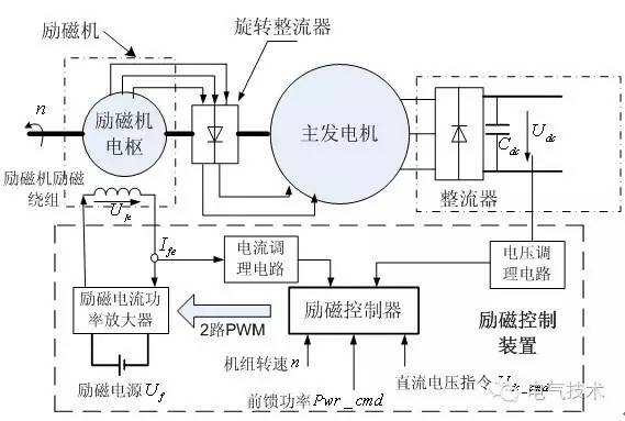 图5为储能电机励磁装置及其控制系统原理框图,励磁装置包括励磁控制器、励磁电流功率放大器、转枢式励磁机及旋转整流器。励磁系统的工作原理为:励磁电流功率放大器在励磁控制器控制下,向转枢式励磁机的励磁绕组提供励磁电流,实现第一级励磁功率放大;励磁机转子电枢输出交流电压,经同轴的旋转整流器向主发电机转子上的励磁绕组提供励磁电流,实现第二级励磁功率放大。
