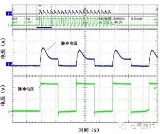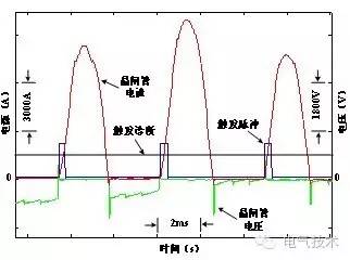 图10为晶闸管的端电压、阳极电流和触发脉冲波形,可见依靠预触发脉冲即实现了晶闸管的可靠导通。