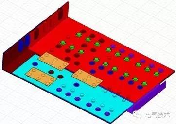通过对二极管钳位三电平拓扑结构的各种开关逻辑切换的换流过程进行分析,对主回路复合母线结构的分层和进出线进行了初步设计,通过对复合母线开不同类型的电气孔进行并联器件外围电路对称性的匹配,确定了最佳的母线方案,母线模型如图12所示。