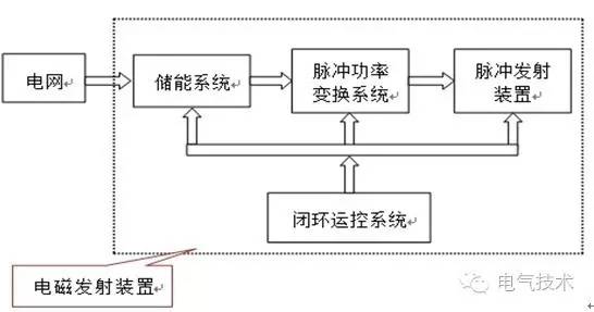 电磁发射系统的工作原理是:储能系统以较小的功率长时间地从电网吸收和存储能量;当储存的能量满足发射所需后,一旦接收到发射命令,立即向脉冲功率变换系统释放能量;脉冲功率变换系统将储能系统释放的电能变换为脉冲发射装置工作所需的脉冲电能,产生电磁力推动发射体运动;闭环运动控制系统实时地控制发射体的运行轨迹,确保在预定的位置将其加速至设定的末速度,完成发射任务。