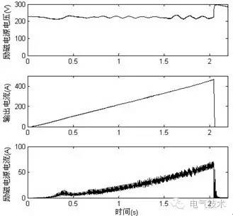 图6为励磁装置在发射过程中的励磁电源电压、输出电流和励磁电源电流波形。可以看出励磁电源电压基本稳定,输出电流和励磁电源的电流呈线性增加。