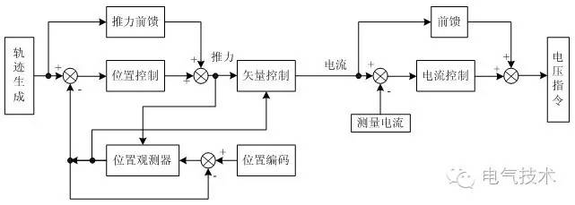图16为闭环控制系统框图。轨迹生成算法生成理想的发射轨迹曲线;位置观测算法根据从位置传感器获得的位置编码信息,观测出直线电机动子的瞬时位置和速度;位置控制算法实时计算出动子实际轨迹精确跟踪预设发射轨迹曲线所需的给定电磁力的大小;矢量控制算法计算直线电机定子所需的励磁电流和转矩电流;最后通过电流闭环控制算法获得直线电机定子的电压指令,下达给脉冲功率变换系统,实现了“信息流”对“能量流”的控制,保证发射目标的实现。