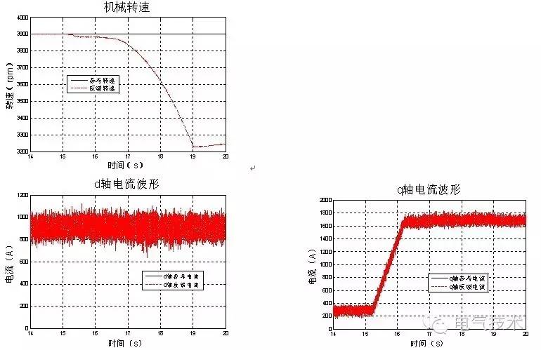 采用上述改进后,电机在高转速和大突变条件下仍然可以实现转矩电流的精确跟踪,并保证控制的稳定性。电机转速、d轴和q轴电流波形如图4所示。