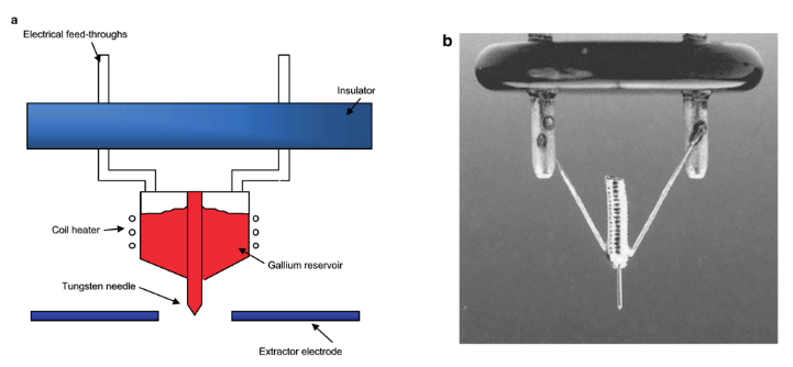 有众多金属或合金可以作为液态金属离子源(LMIS),但最普遍商业化的是Ga金属的离子源,见图4。Ga具有熔点低(约30 ℃);不与钨针尖表面反应,可避免长期储存使用中与钨金属发生合金化反应;同时,Ga的蒸气压低,真空中不挥发;表面能低,可以在钨针尖表面被操控等一系列优点。与场发射电子束光源类似,Ga+离子同样也是分两步产生: