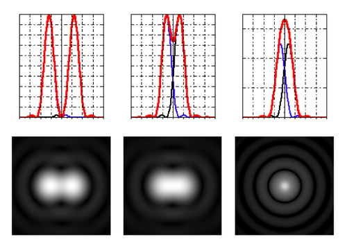 我们知道两个点如果能被光学设备区分开,需要满足瑞利判据(Rayleigh Criterion),见图2,它是衡量光学仪器解析能力的度量。能分辨的最小距离δ 近似表示为,