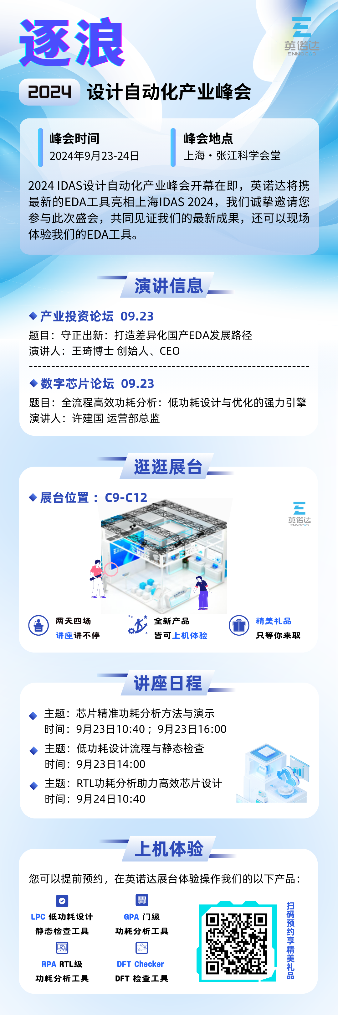 9月23-24日,英诺达将亮相在上海张江科技科学会堂举办的第二届设计自动化产业峰会IDAS 2024,在会上英诺达将详细阐述此次GPA的最新功能,我们也在展台处设置了体验区,您可以移步至英诺达的展台上机操作英诺达的系列EDA工具。