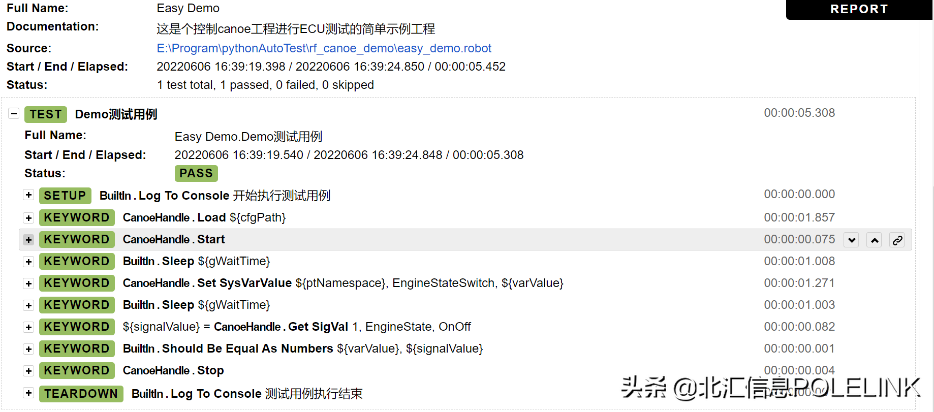 IT领域的开发理念和以太网等具体通信技术经过优化改造后在汽车上的应用,为软件定义汽车的实现提供了诸多方法论和技术手段上的支撑和支持。同样,发源于IT行业的测试技术也越来越多地被应用到汽车电子的测试中,在过去一年的项目中,北汇已经将Robot Framework与CANoe等汽车行业的主流工具进行了结合应用,积累了一些实践经验,期待与大家深入交流和探讨。下期我们将带来Robot Framework结合Jenkins的测试实践应用的主题,敬请关注。