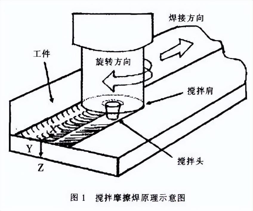 搅拌摩擦焊是一种固相连接方式。在搅拌摩擦焊过程中,一个柱形带特殊轴肩和针凸的搅拌头旋转着插入被焊工件,搅拌头和被焊材料之间的摩擦产生了摩擦热,使材料热塑化,当搅拌工具沿着待焊界面向前移动时,热塑化的材料由搅拌头的前部向后部转移,并且在搅拌工具的机械锻造的作用下,实现工件间的固相连接。