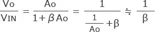 在输入与输出的传递函数公式中,假设运算放大器的开环增益足够大,即AO>>1,则低频的负反馈电路的增益可近似于1/β。