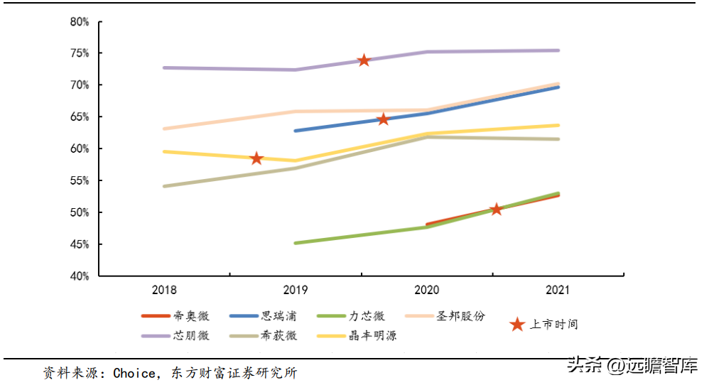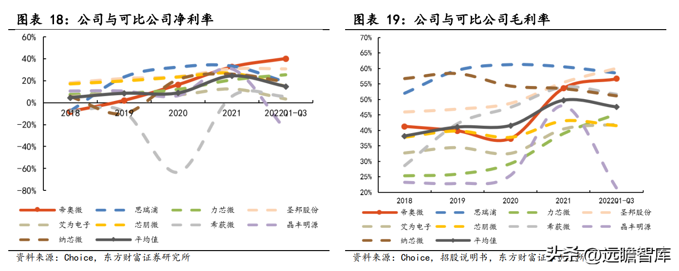 2018 至 2022Q1-Q3,公司毛利率水平普遍高于同行业平均值。2020 年,由于公司自身销售结构调整,公司毛利率与可比公司相比偏低。但 2020 年底,由于芯片市场缺货严重,市场价格普遍提高,模拟芯片整体毛利率有所提升,公司也提高了其部分产品的售价,毛利率在 2021 年实现了大幅提升并达到了高于行业平均值的水平。2022Q1-Q3,公司毛利率水平已位居行业前列,产品竞争优势显著。