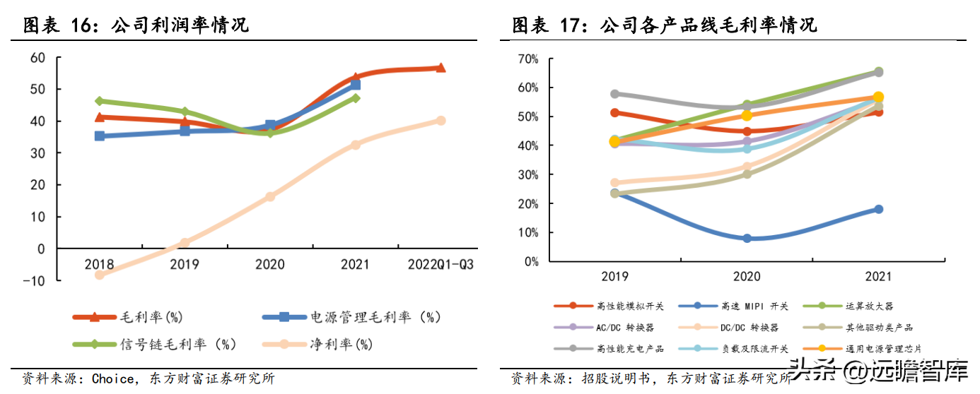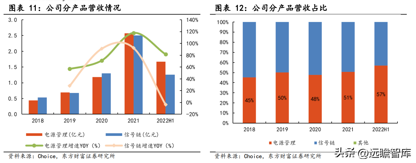 2018-2022H1,公司的信号链产品营收和电源管理产品营收均与总营收保持同步高速增长,2018-2021 年,信号链产品营收 CAGR 达到 67.7%,电源管理产品营收 CAGR 达到 80.1%。