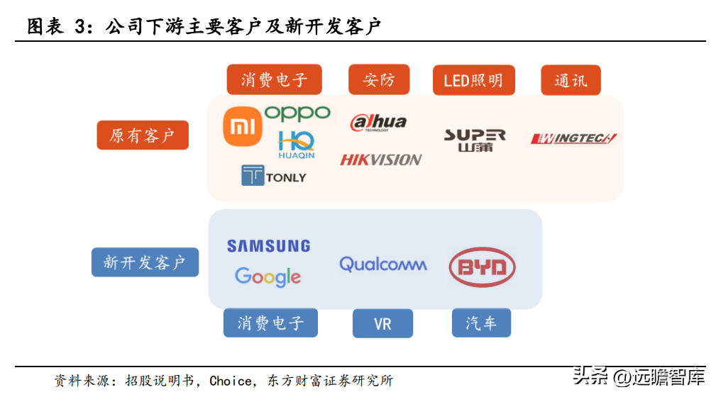 公司采用 Fabless 经营模式和 “经销为主、直销为辅”的销售模式,已与行业内资深电子元器件经销商—— WPI 集团、文晔集团、联烨集团等建立了长期稳定的合作关系,并进入了包括 小米、OPPO、海康威视、大华、山蒲照明、华勤、通力以及闻泰等多家终端品牌客户的供应链体系。其中,小米和 OPPO 既是公司终端客户也是公司股东,并与公司签署了长期协议。公司通过研发新产品进一步拓展了汽车电子、VR 等市场,并在客户方面布局了谷歌、Facebook、比亚迪和高通等知名企业,预计下游客户需求将不断增长。
