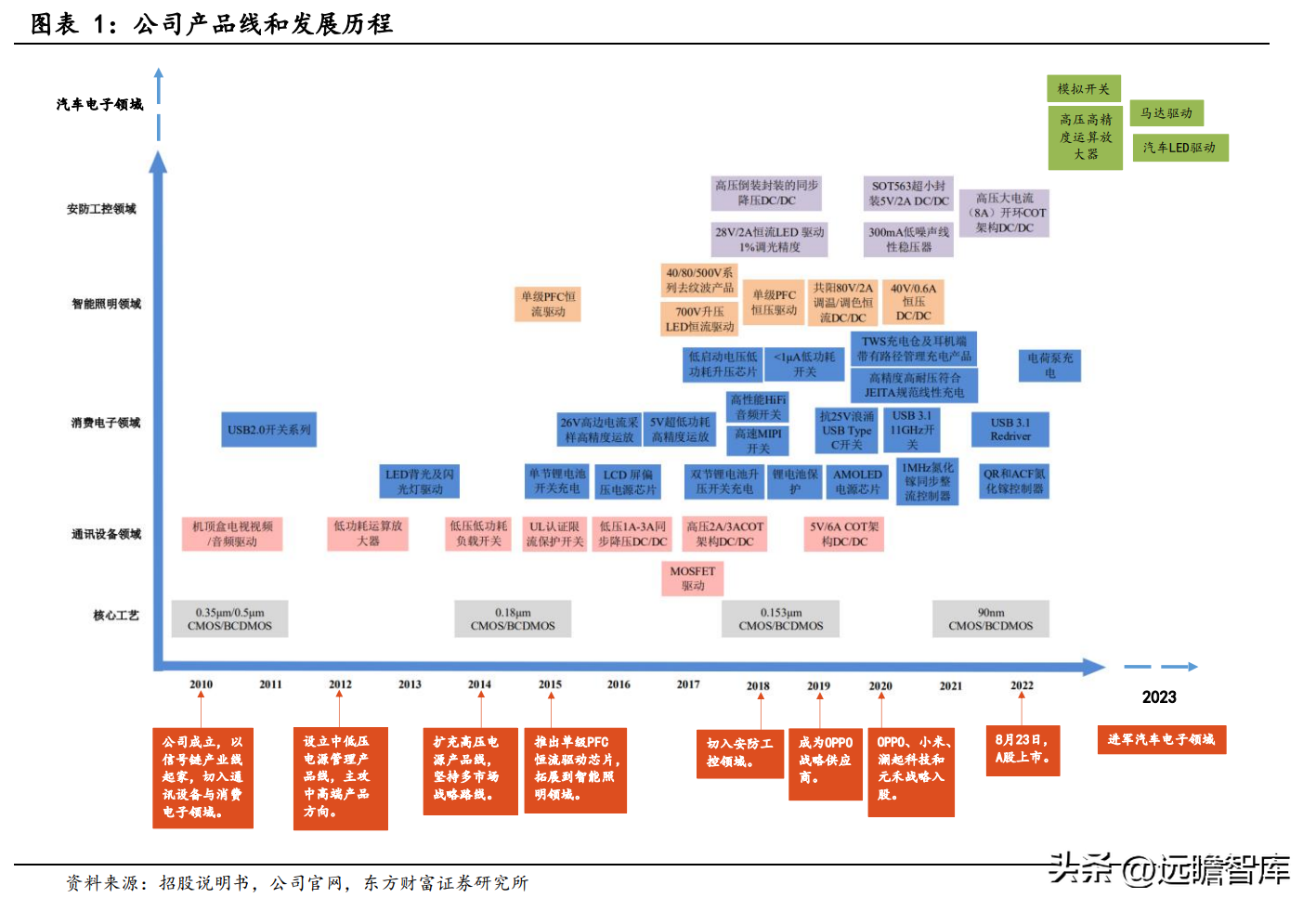 公司成立于2010年,是国内模拟芯片行业领先的集成电路设计企业。2010年公司以信号链产品线起家;2012年设立了中低压电源管理产品线,主攻中高端产品方向;2014年扩充了高压电源产品线。