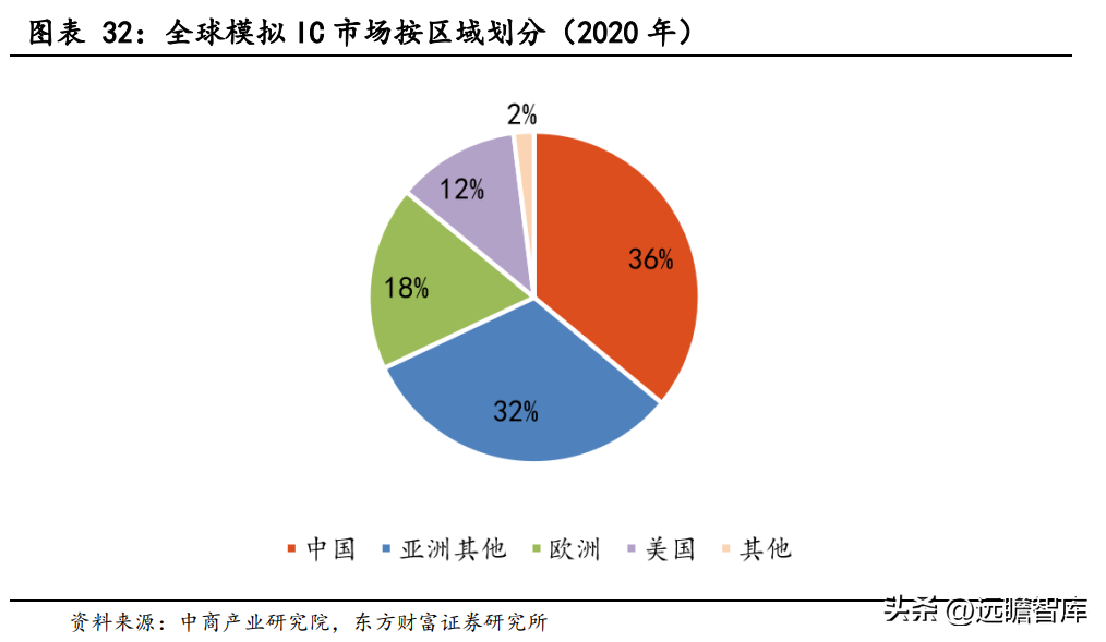 中国是模拟 IC 最大下游应用市场。从区域分布来看,中国是最大的模拟 IC 市场。2020 年,中国模拟 IC 市场占全球市场规模的 36%,有近205亿美元的规模,位列第一,市场空间广阔。