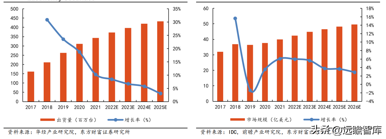 智能电视和高清传送频道的普及带动机顶盒向智能化方向升级。华经产业研究院预计,2022 年全球 IPTV/OTT 机顶盒出货量为 3.72 亿台,并保持平稳增长,到 2025 年将达到 4.33 亿台。
