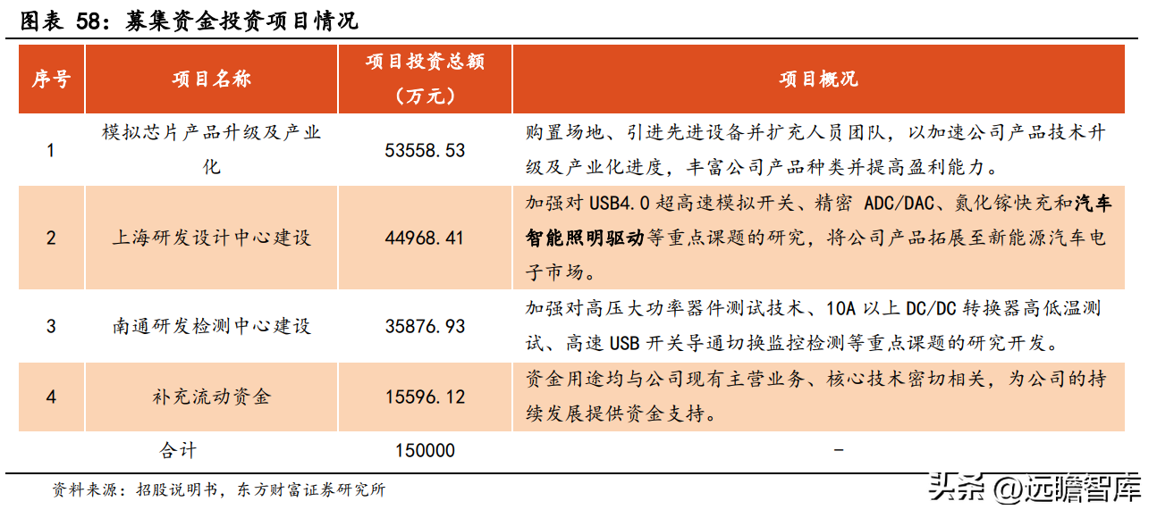 公司发行上市募集资金拟用于“模拟芯片产品升级及产业化项目”、“上海研发设计中心建设项目”、“南通研发检测中心建设项目”以及“补充流动资金”项目,合计使用募集金额 15 亿。