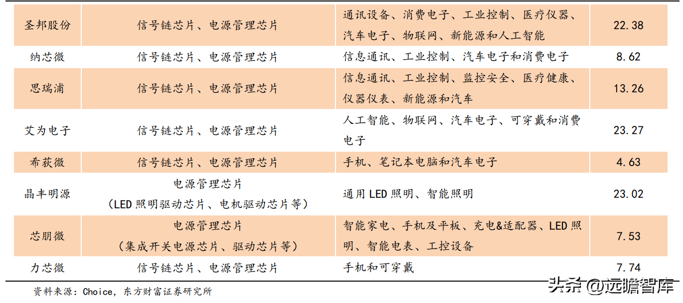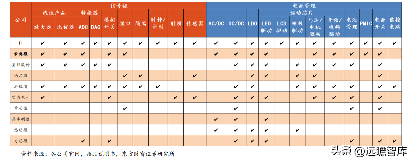 公司产品广泛覆盖了信号链芯片和电源管理芯片下的各细分领域。对比同行业可比公司,行业龙头 TI 已实现了产品的全布局,公司产品布局涵盖 14 个细分领域,与国内龙头厂商圣邦和思瑞浦相当,布局较为完善,处于第二梯队。