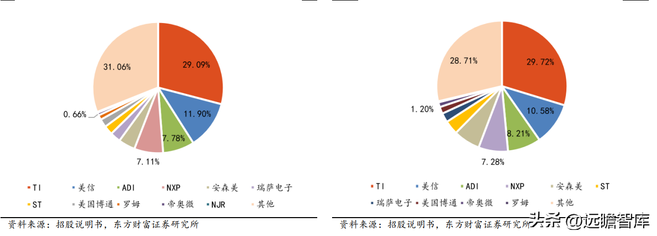 国外厂商在模拟 IC 行业具有先发优势,在技术、资金、客户资源、品牌等方面都处于领先地位。而国内企业由于起步较晚,在产品和技术方面积累不足,企业规模和市场地位都与国际龙头有较大差距。