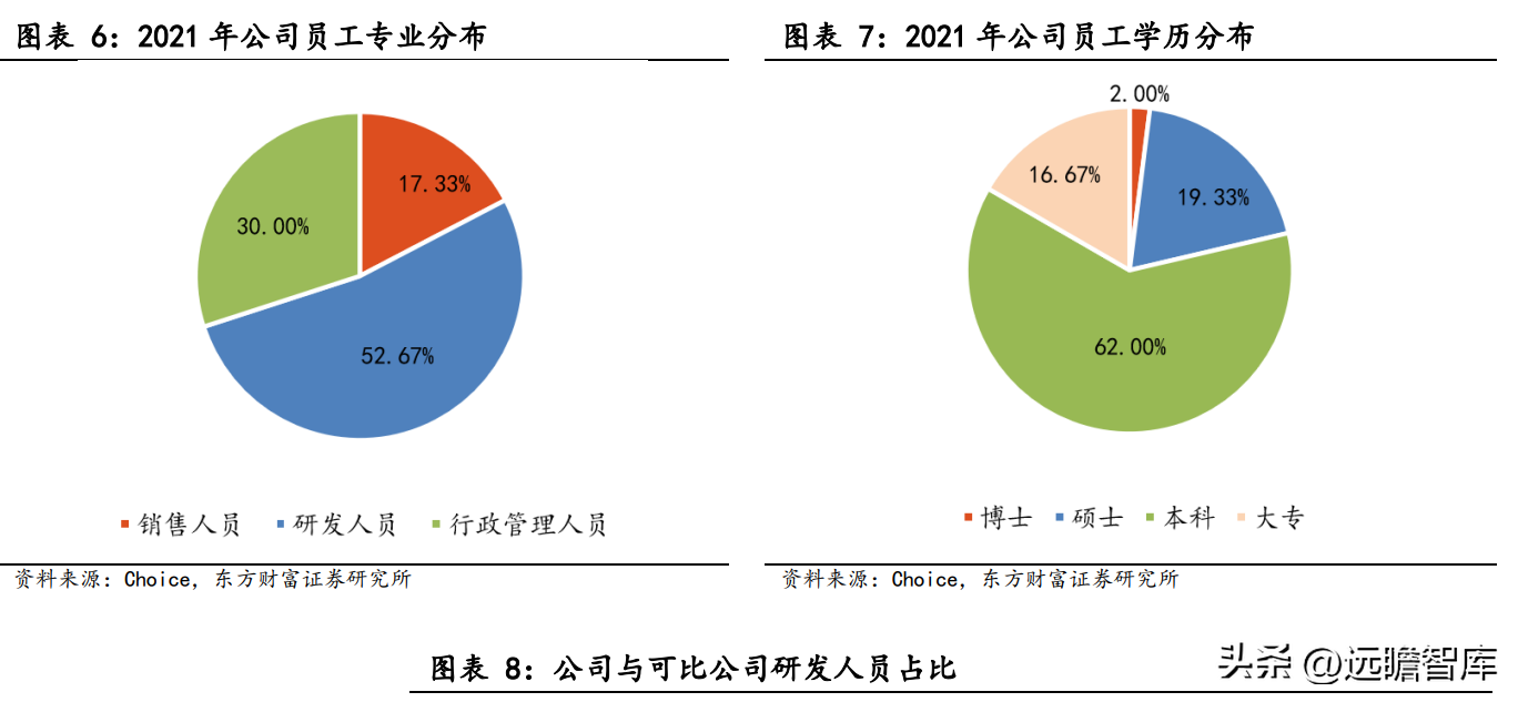在研发人员方面,公司积极招揽人才,不断壮大研发团队,目前已在核心技术领域组建了专业的研发团队。截至 2021 年 12 月 31 日,公司员工总数为 150 人,其中研发人员 79 人,占比达 52.67%,本科及以上学历的员工占比达 83.33%。研发人员是模拟公司的核心竞争力之一,大部分模拟公司会借助上市融资大幅招聘研发人员,提高研发人员占比,预计公司后续会加大招聘力度,提升核心竞争力。