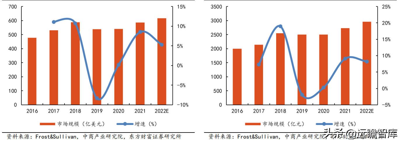 据 Frost&Sullivan 数据显示,全球模拟 IC 市场规模预计将在 2022 年达到 617 亿美元,2016-2022 年 CAGR 为 4.35%。中国模拟 IC 市场规模在新技术和产业政策的驱动下,将在 2022 年达到 2956.1 亿元,2016-2022 年 CAGR 为 6.77%,增速略高于全球。