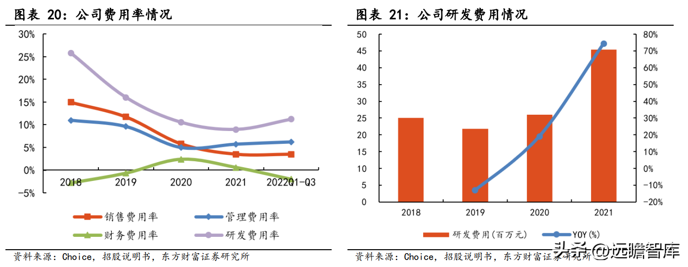 从期间费用率看,2018 至 2022Q1-Q3,随着营业收入的增长,公司的管理费用率和销售费用率波动下降并逐渐趋于稳定,财务费用率也普遍处于较低的水平,体现了公司有着良好的 费用管控能力,进一步保障了净利润。公司的研发费用从 2018 年的 0.25 亿元增长至 2021 年的 0.45 亿元。2018-2021 年,公司研发费用率随着营业收入的增长有所下降,但 2022Q1-Q3 已呈现出上升趋势,达到 11.2%。