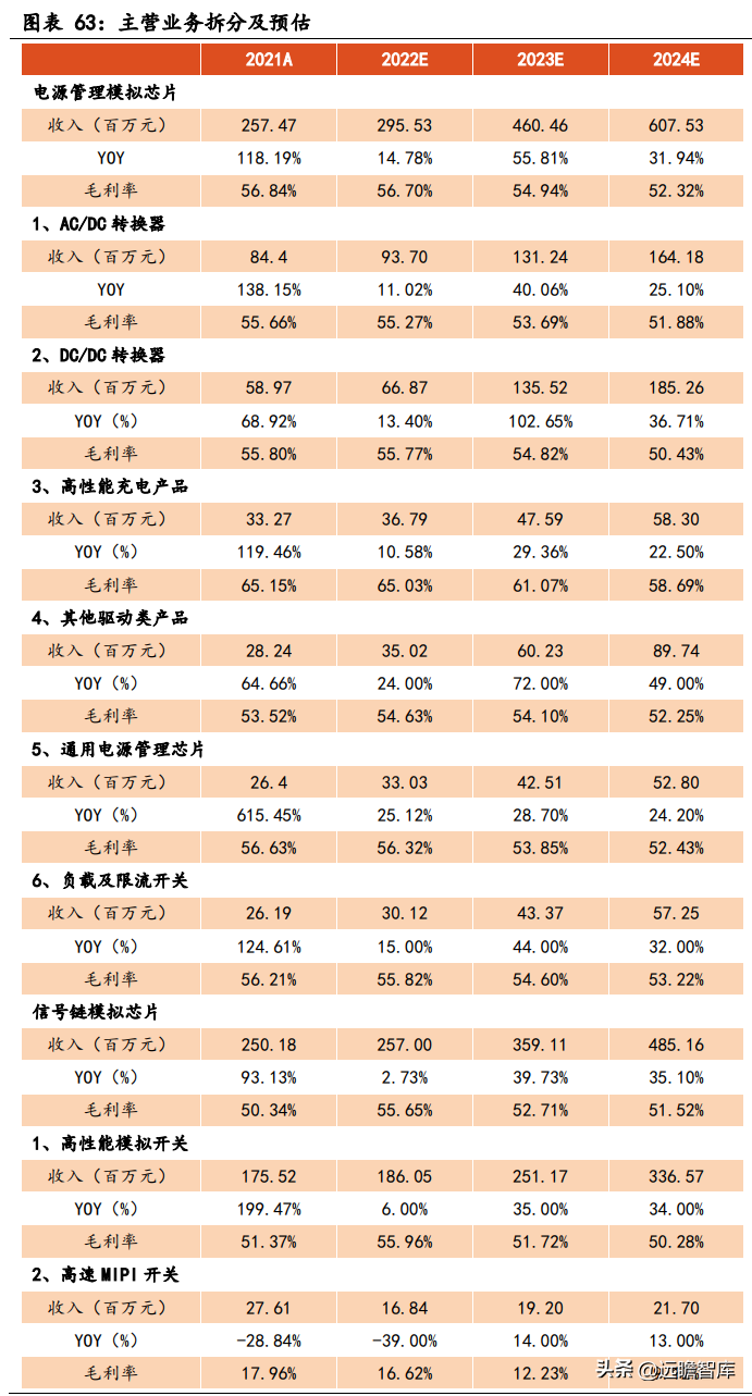 营业收入: 根据公司在 2021 年年报中将营业收入按产品进行拆解,分为电源管理模拟芯片和信号链模拟芯片两大类。同时,公司通过马达驱动、LED 驱动等产品切入汽车电子市场,该领域为公司新切入的增量市场。