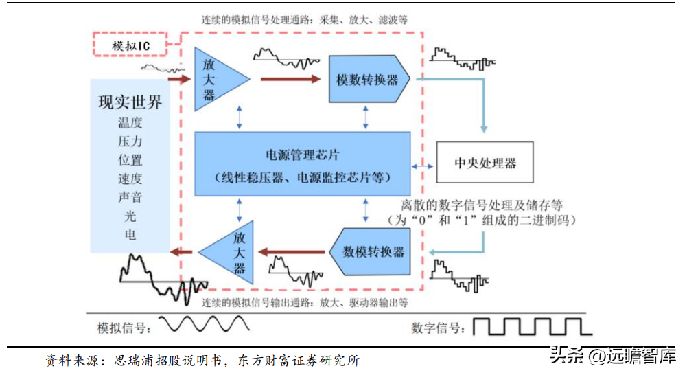 电源管理芯片用于对电子设备系统中的电能进行变换、分配、检测及其他电能管理;信号链芯片用于对模拟信号进行收发、转换、放大、过滤等;射频芯片则用于处理射频频段,主要在无线连接中实现信号的发射和接收。