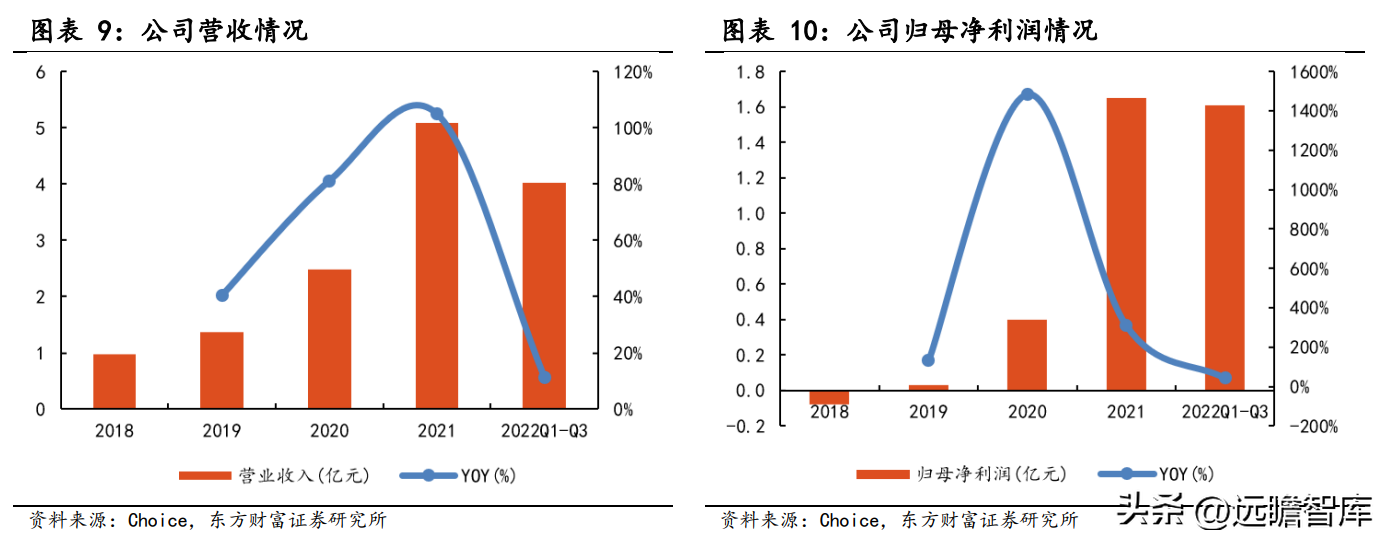 得益于半导体行业景气度提升、公司产品线不断拓展和市场份额增加,2018-2021 年,公司营业收入快速增长,CAGR 达到 73.7%。2021 年实现营收 5.08 亿元,同比增长105.08%。