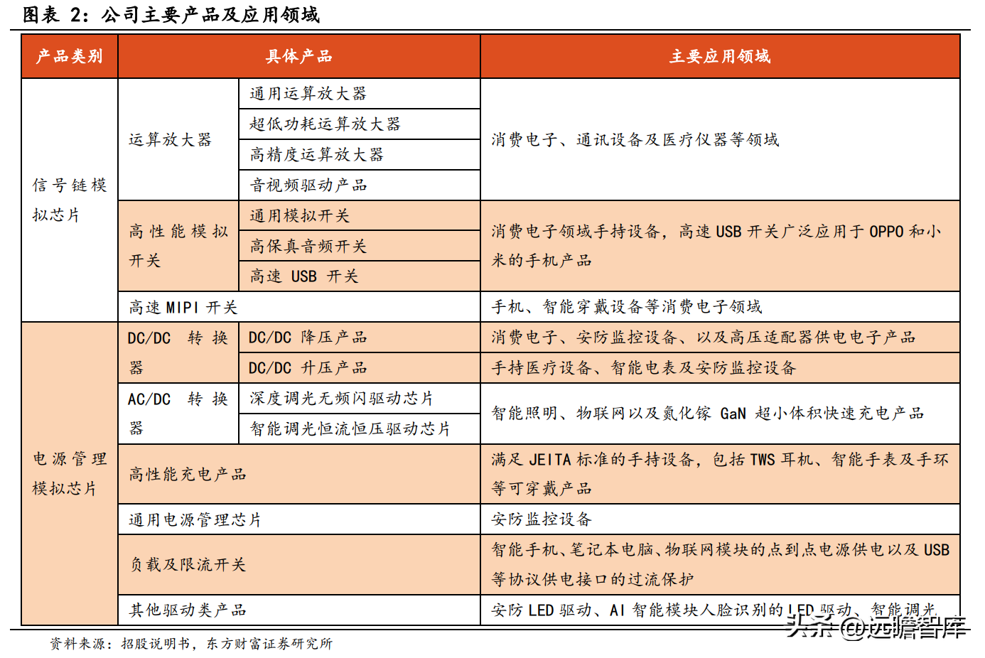 电源管理模拟芯片包括 DC/DC 转换器、AC/DC 转换器、高性能充电产品、通用电源管理芯片、负载及限流开关以及其他驱动类产品,主要应用领域覆盖消费电子、智能 LED 照明、信息通讯、工控安防等。