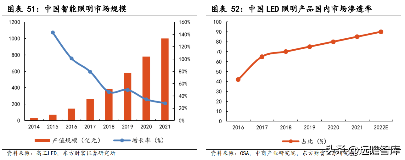 高工 LED 数据显示,中国智能照明市场规模逐年上升,2021 年达到了 1000 亿元。同时,LED 照明产品的国内市场渗透率也在不断提升,预计 2022 年将提升至 90%。