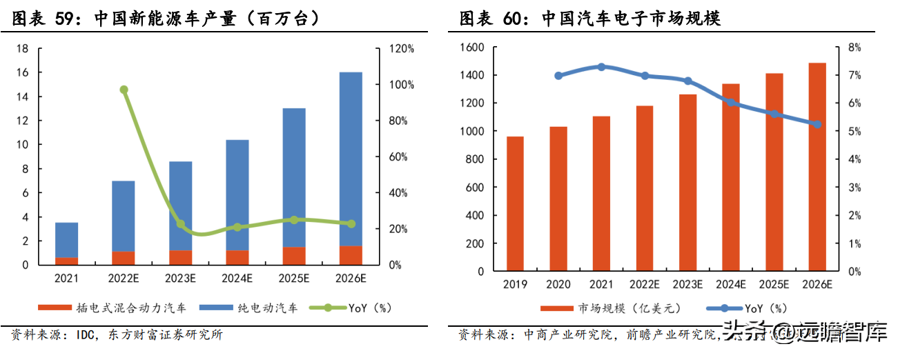 据 IDC 预计,中国新能源汽车产量将由 2021 年 355 万台增长至 2026 年 1598 万台。其中,纯电动汽车产量占比将不断提升。中国汽车电子市场规模保持增长趋势,根据前瞻产业研究院数据,2026 年将达到 1486 亿美元。汽车产业的电动化、智能化发展为模拟芯片行业带来了发展新机遇。
