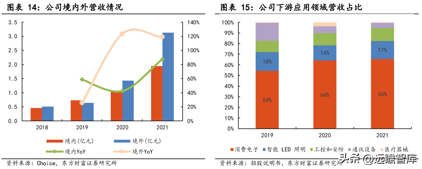 公司产品在消费电子领域的应用包括手机、TWS 耳机、笔记本电脑、智能穿戴设备等。智能 LED 照明是公司产品应用的第二大领域,2021 年在营收中占比达到 16.63%,2019-2021 年 度 CAGR 达到 86%。随着 LED 照明下游个性化、智能化需求的增加和产值规模的增长,公司智能 LED 照明领域营收有望进一步增长。