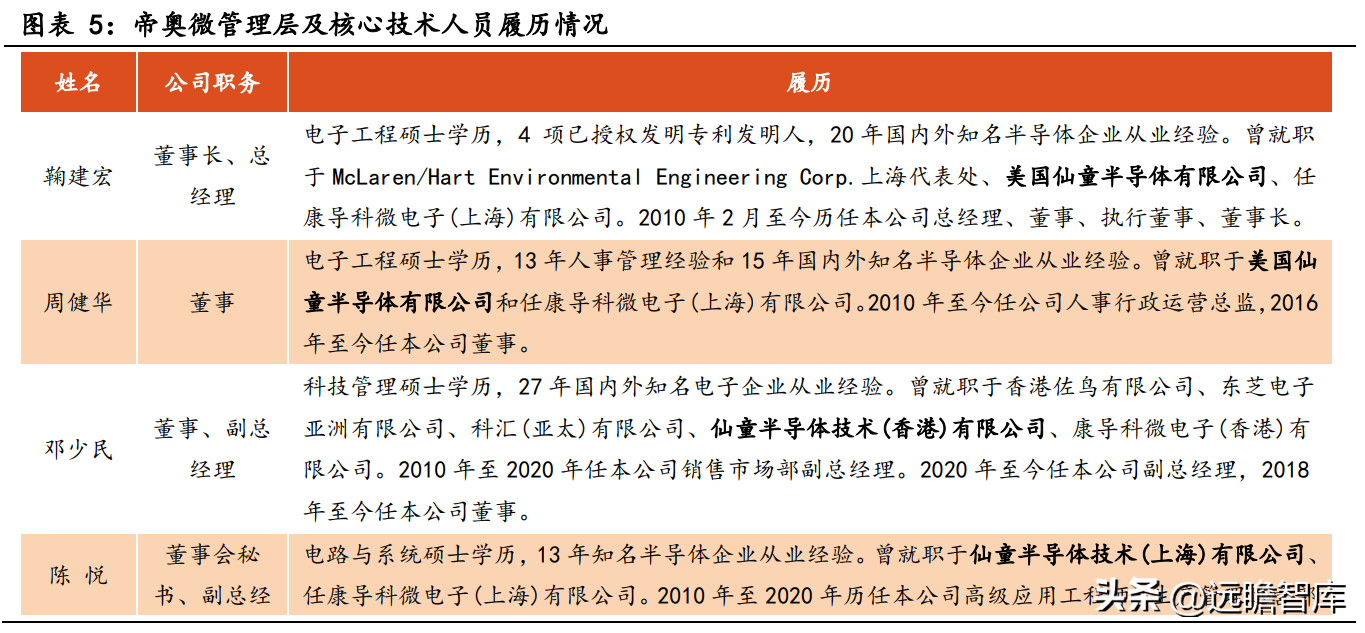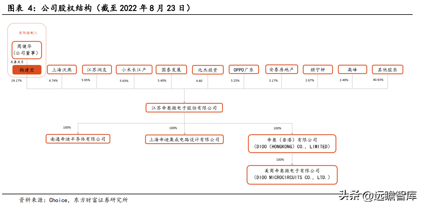 股权结构稳定,股东囊括下游客户。鞠建宏先生直接持有公司 19.17%的股权,为公司控股股东,且担任公司董事长、总经理的职务。鞠建宏与周健华夫妻为公司共同实际控制人。OPPO 和小米既是公司客户也是公司股东,与公司利益一致,有利于公司稳定经营。子公司方面,公司有 2 家境内全资子公司,分别为南通帝迪和上海帝迪,和 1 家境外全资子公司,为香港帝奥微。