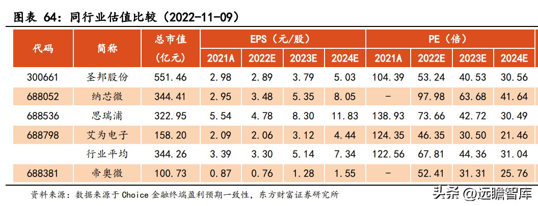 在同业对比中,选取主营业务与帝奥微较为相似,均覆盖了电源管理与信号链模拟芯片的思瑞浦、圣邦股份、艾为电子和纳芯微。2022/2023/2024 年行业一致预期 PE 平均值分别为 68/44/31 倍。