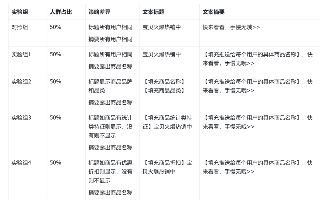 ②模板确定 通过以上几组实验数据,确定针对不同用户群里,最优的文案模板。如针对新用户的文案模板是。标题:【商品品牌】【商品品类】