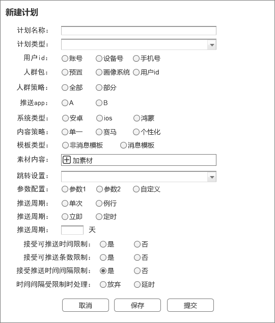 2)素材策略: 前面章节也有所介绍,Push消息的样式主要由通道商提供,作为业务平台,制定最多的还是文案策略。