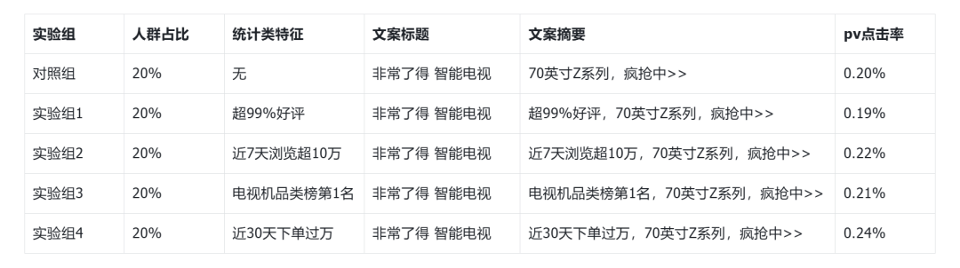 为了事先得出各个统计类特征的影响程度,可以通过AB实验的方式得出。假设我们圈选了1000万对电视机感兴趣的用户,推送的商品是“非常了得”品牌的,“70英寸Z系列智能电视”。AB实验数据如表 2 所示。