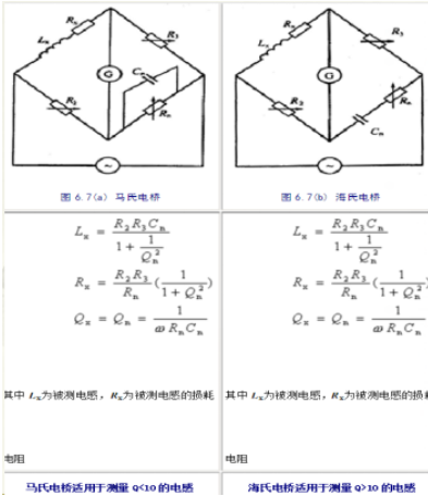 测量电感的交流电桥由如下所示的马氏电桥和海氏电桥两种,分别适用于测量品质因数不同的电感。