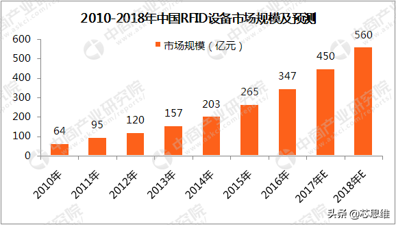 根据中商产业研究院的《2017-2022年中国物联网行业市场前景及投资机会研究报告》显示,2017年中国RFID设备的市场规模预计达到450亿元,2018年预计中国RFID市场规模达560亿元。2010-2016年RFID设备的年复合增长率为32.5%。产业分布主要以华东、华南、华北地区为主。