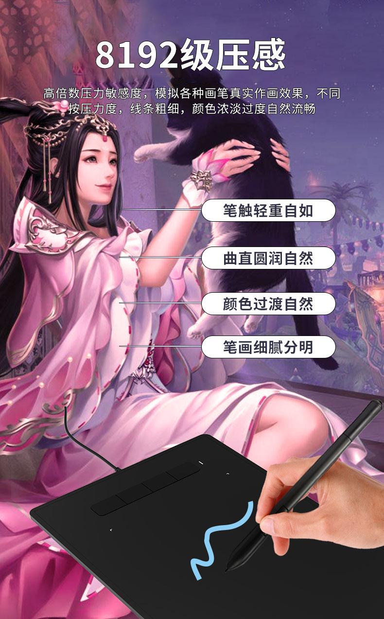 汉王-酷学电子手写数位板运用8192级压感技术,可以模拟各种画笔真实作画效果,通过不同力度的按压,笔迹线条可以出现不同程度的变化,过度流畅自然。