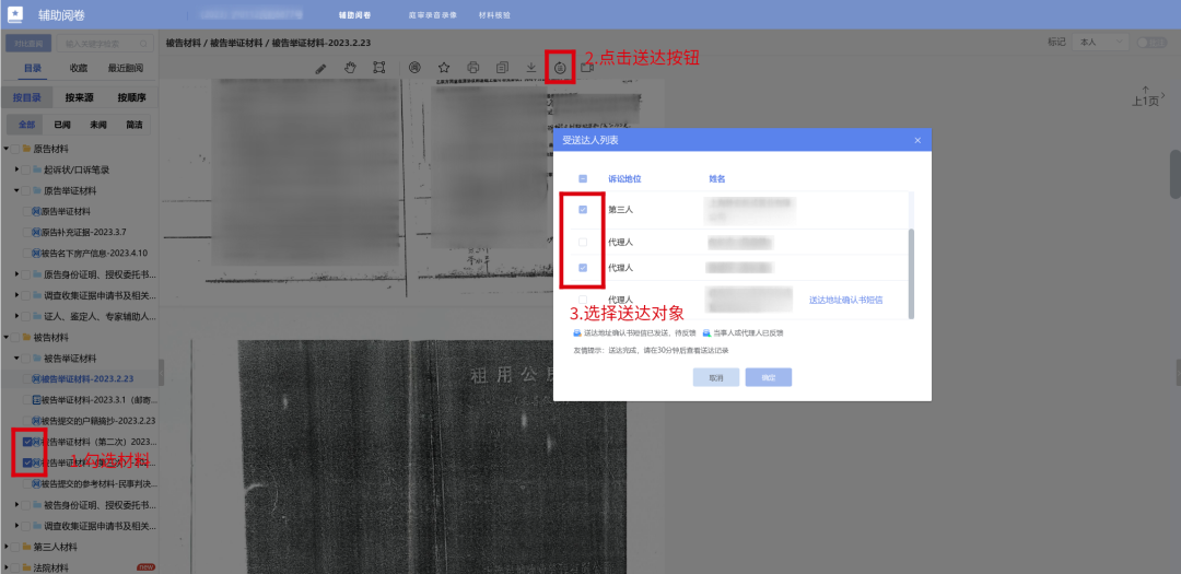除了“文书送达”模块,电子送达也融合到了新的电子阅卷系统,勾选需要进行电子送达的相应材料,选择受送达对象(需要提前录入并确认送达对象的手机号),便可在电子卷宗内直接完成电子送达,减少送达操作步骤。