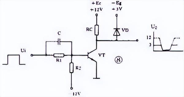 能把脉冲电压维持在某个数值上而使波形保持不变的电路称为箝位器。它也是整形电路的一种。例如电视信号在传输过程中会造成失真,为了使脉冲波形恢复原样,接收机里就要用箝位电路把波形顶部箝制在某个固定电平上。下图 8 中反相器输出端上就有一个箝位二极管 VD 。如果没有这个二极管,输出脉冲高电平应该是 12 伏,现在增加了箝位二极管,输出脉冲高电平被箝制在 3 伏上。