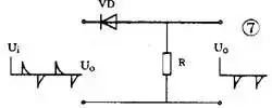 能限制脉冲幅值的电路称为限幅器或削波器。图 7 是用二极管和电阻组成的上限幅电路。它能把输入的正向脉冲削掉。如果把二极管反接,就成为削掉负脉冲的下限幅电路。