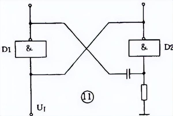 用集成门电路也可组成单稳电路。图 11 是微分型单稳电路,它用 2 个与非门交叉连接,门 1 输出到门 2 是用微分电路耦合,门 2 输出到门 1 是直接耦合,触发脉冲加到门 1 的另一个输入端 U I 。它的暂稳态时间即定时时间为:t t = ( 0.7 ~ 1.3 ) RC 。