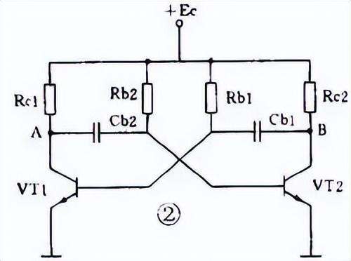 下图2是一个典型的分立元件集基耦合多谐振荡器。它由两个晶体管反相器经 RC 电路交叉耦合接成正反馈电路组成。两个电容器交替充放电使两管交替导通和截止,使电路不停地从一个状态自动翻转到另一个状态,形成自激振荡。从 A 点或 B 点可得到输出脉冲。当 R b1 =R b2 =R , C b1 =C b2 =C 时,输出是幅度接近 E 的方波,脉冲周期 T=1.4RC 。如果两边不对称,则输出是矩形脉冲。