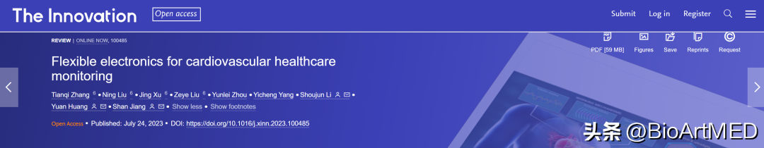 2023年7月28日,来自中国医学科学院阜外医院的李守军 教授、黄源 医师与来自西安电子科技大学杭州研究院的江山 副教授合作以 Flexible electronics for cardiovascular healthcare monitoring 为题在The Innovation 杂志发表了综述文章,他们总结了综述了柔性电子在CVDs监测方面的最新进展,聚焦于血压、心电图、超声心动图和心外膜四个典型临床应用场景,并给出了柔性电子之于CVDs临床应用这一医工交叉领域的挑战和发展方向。
