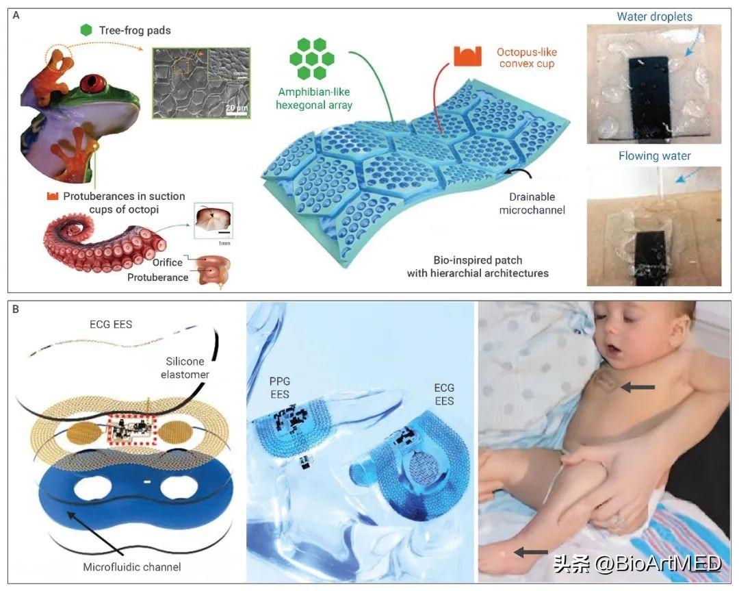 ECG监测 是另一种安全、无创、简单且有效的CVDs监测方法,通过测量心脏的电信号来评估心脏的功能和节律。目前,柔性电子应用于ECG监测主要是通过柔性电极,即柔性干电极和柔性湿电极,二者的区别在于湿电极需要凝胶/贴片等粘附介质而干电极不需要。湿电极能提供更优的信号质量,但粘附介质存在材料要求高、后续清洁等缺点;干电极可直接使用,信号强度更高,但易导致伪影。图3展示了柔性干电极用于ECG监测。研究者仿树蛙脚垫和章鱼吸盘结构调整电极表面形貌以增强粘附作用并有效抑制伪影(图3A) 或采用分形设计出超薄、超软的电极并应用于新生儿的ECG监测(图3B) 。