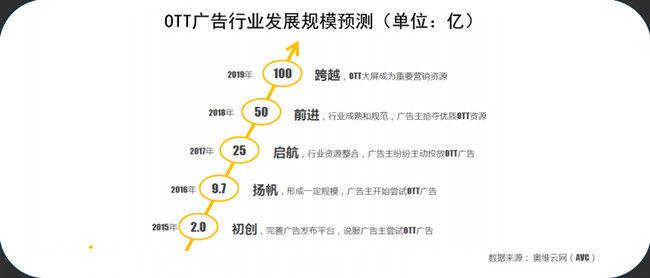 自2015年OTT广告初创以来,2016年全年OTT广告行业呈现出爆发式增长的盛况,广告投放规模比2015年增长了384%,预计今年将突破25亿元,2019年将达到百亿规模。
