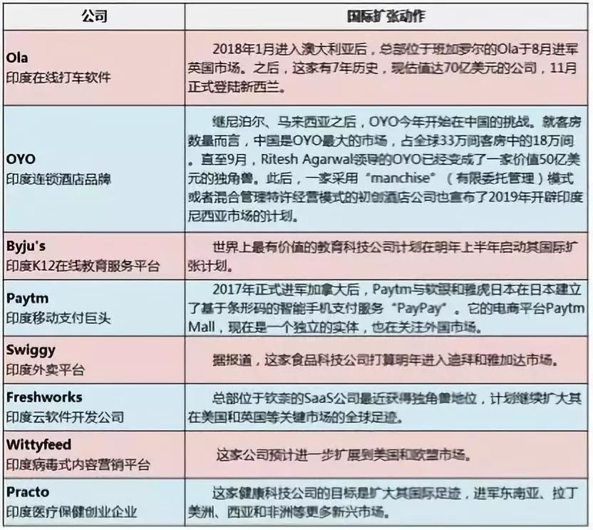 在今年1月份进军澳大利亚珀斯时,印度最大的本土打车公司Ola就揭开了全球化的序幕。不久,连锁酒店OYO也紧随其后大举扩张。印度最新的独角兽,在线教育公司Byju’s也宣布了2019年早期的国际计划。