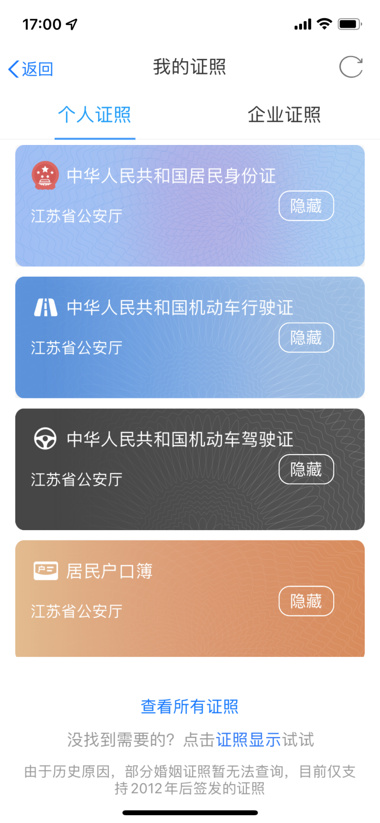 在首页点击“苏证通(亮证)”/“亮证”,通过人脸识别后,就能申领身份证、驾驶证、结婚证、户口簿等证件的电子证照。